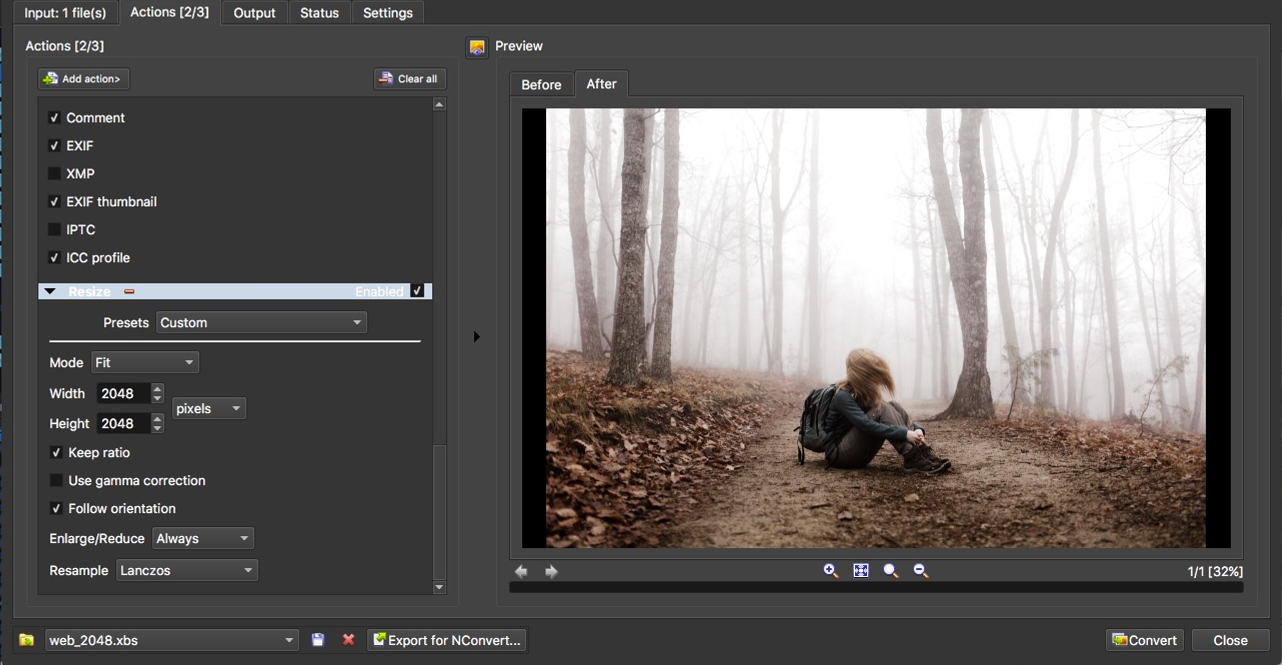 Build your batch action in the Batch Convert Actions tab. This one uses Metadata Clean to remove Exif metadata and Resize to output an image that's 2048 pixels on the long side. build_batch_actions Technical Details Taken: August 1, 2018